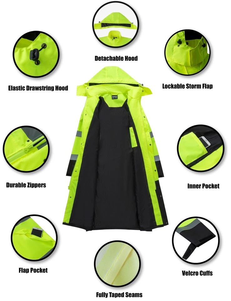 Men’s Hi-Vis Long Safety Raincoat Reflective Waterproof Rain Coat Hooded
